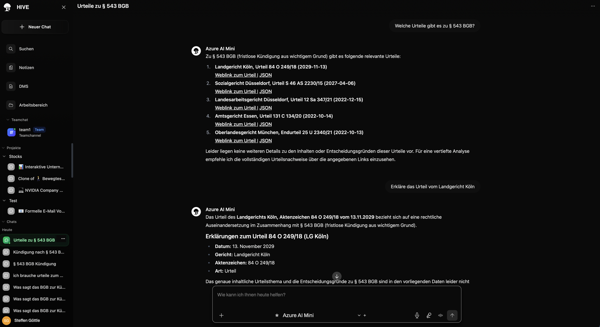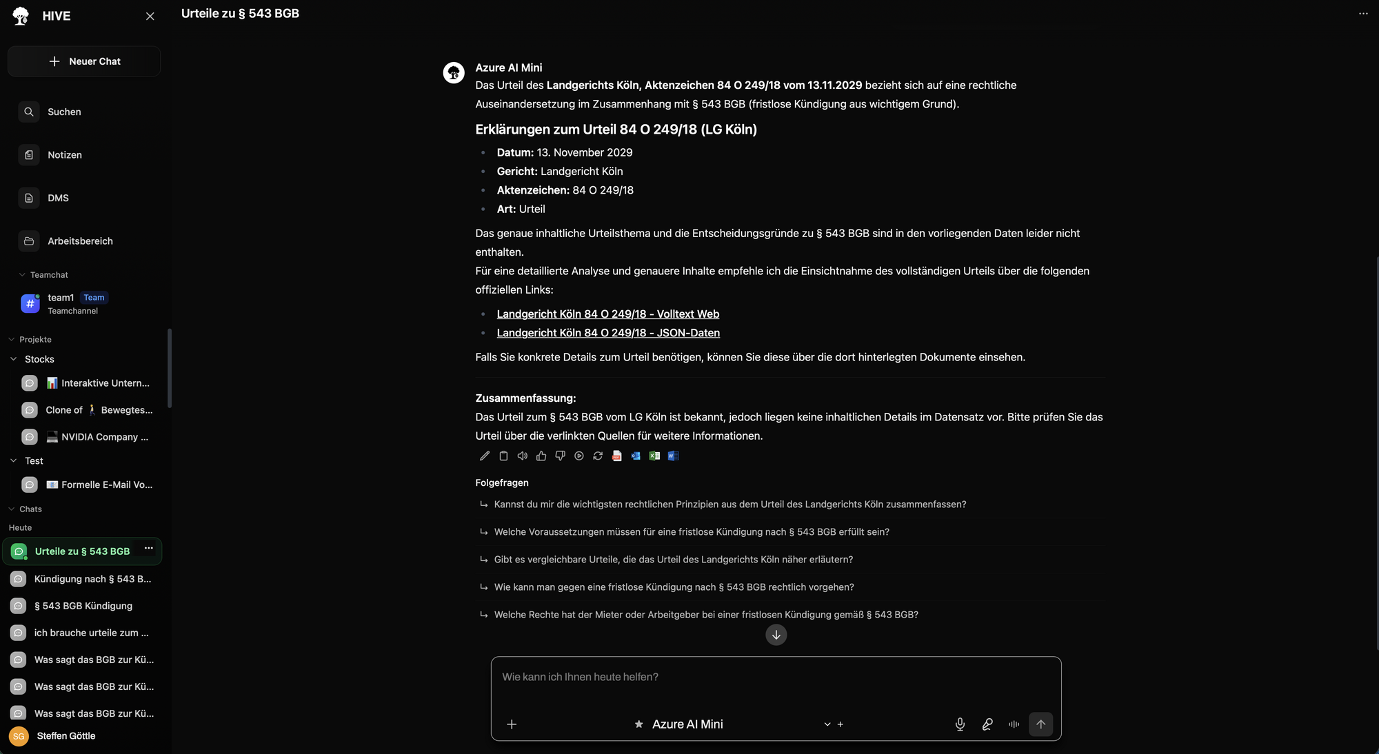 Damit wird HIVE zu einem aktiven Recherche- und Analysepartner für alle, die regelmäßig mit rechtlichen Fragen, Urteilen oder Paragraphen arbeiten.