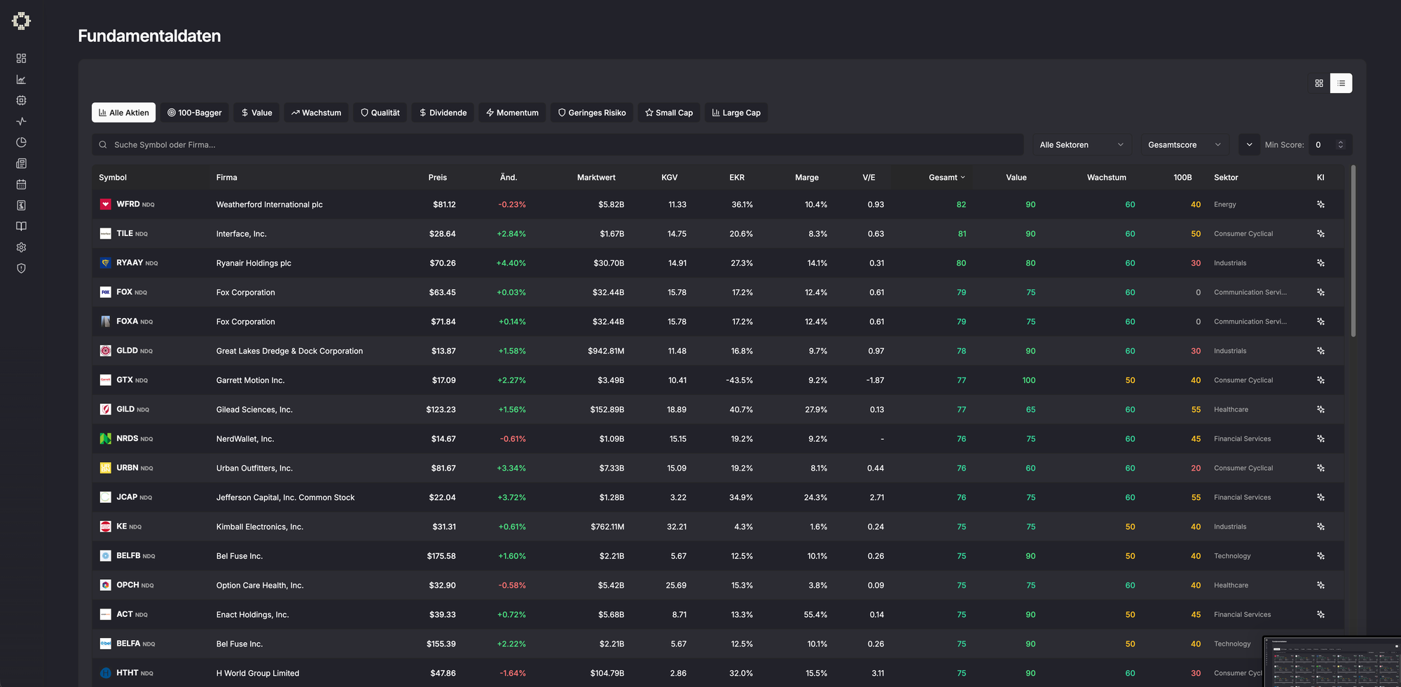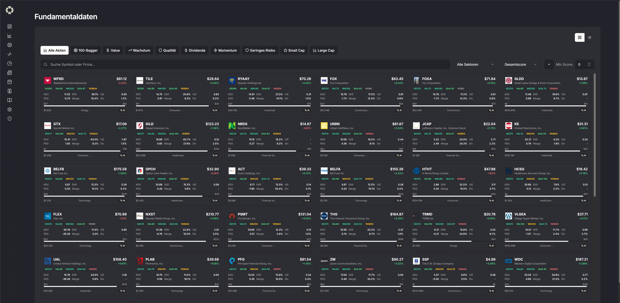 - vordefinierte Filter wie Value, Growth, Quality und Momentum
