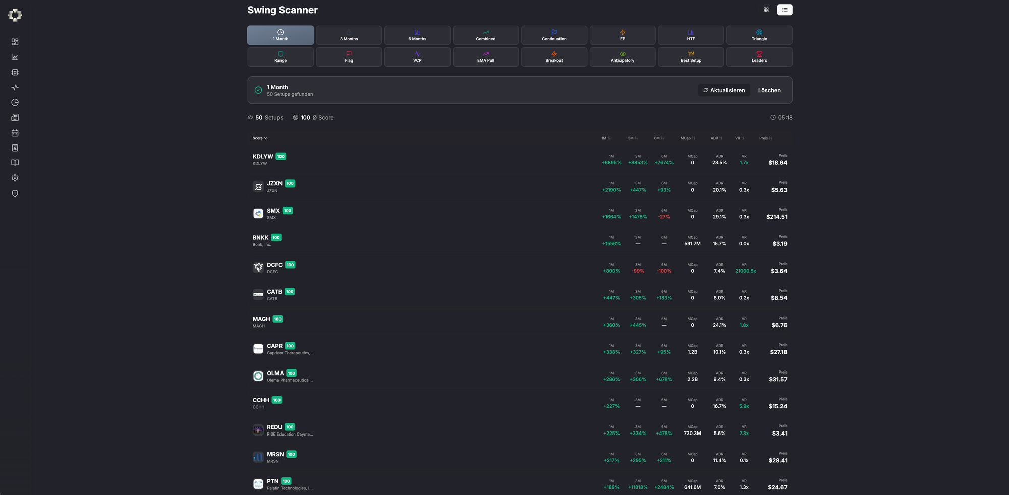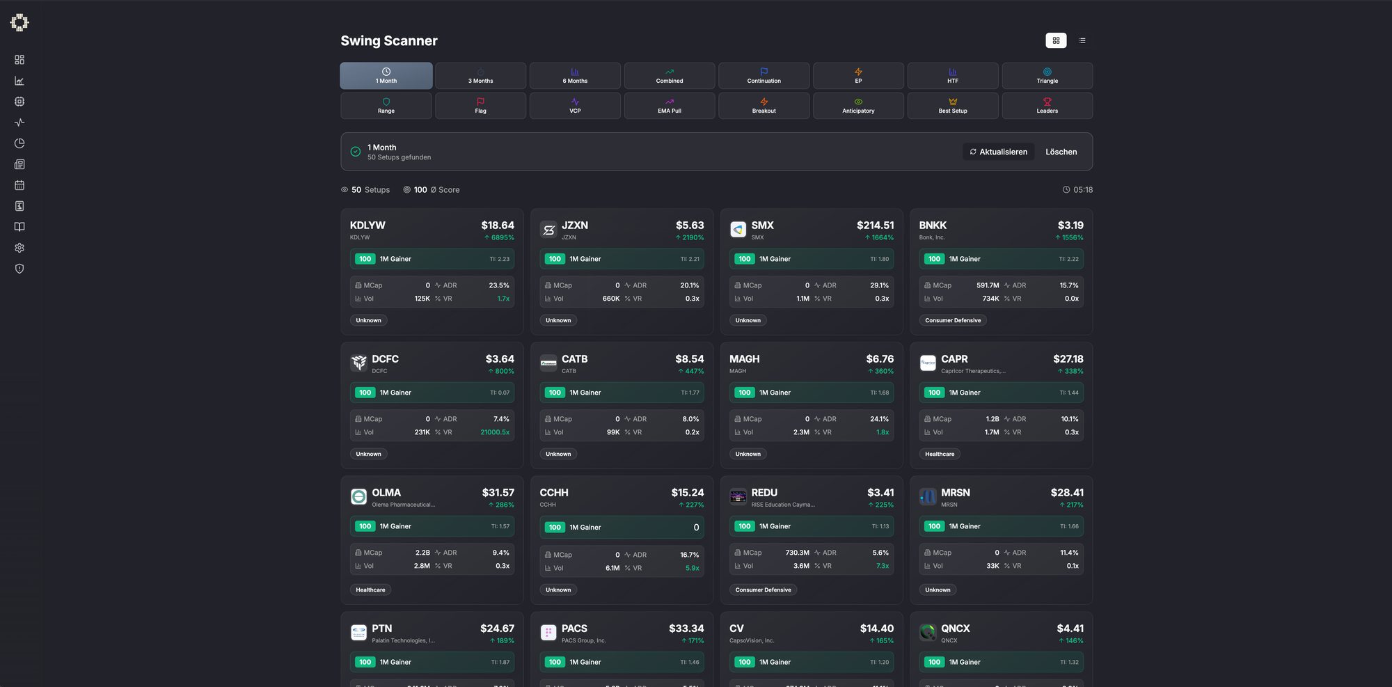 Zusätzlich gibt es einen Swing-Tab, inspiriert von erfolgreichen Tradern wie Qullamaggie, Minervini und weiteren, der Momentum-Setups gezielt herausfiltert.